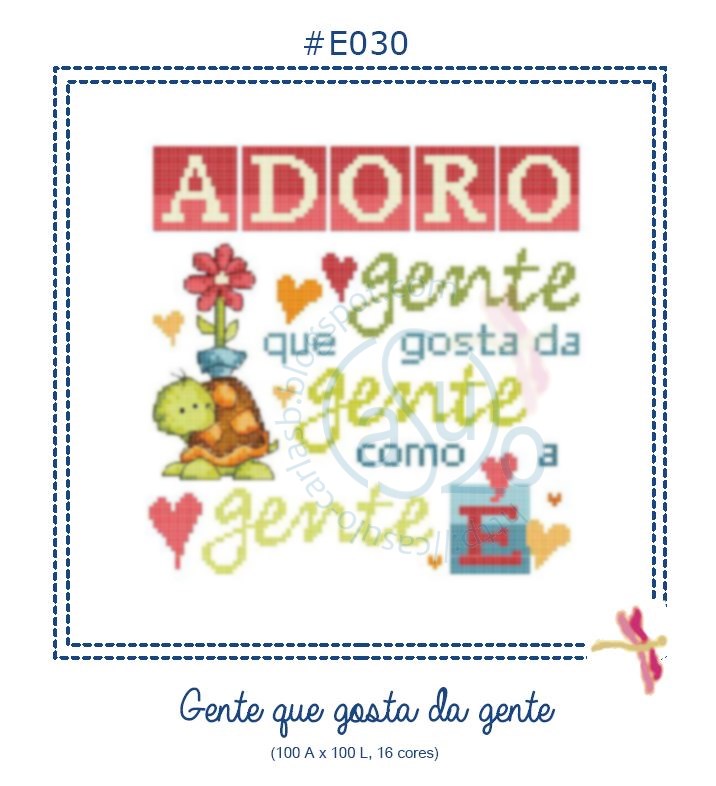 | PVP (euros): 3 Tamanho (pontos): 100x100 Cores (DMC): 16 Encomendas : envie mensagem para casulo.carlasb@gmail.com com indicação da referência do gráfico. Receberá as instruções para proceder ao pagamento. Envio: Após confirmação do pagamento será enviado para o email de contacto o gráfico em formato PDF. Para o imprimir use o Acrobat Reader ou equivalente no seu computador. Pagamento: aceito pagamento por PayPal, Transferência ou Depósito bancário. |