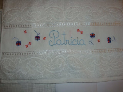 São em linho fino, bordadas a algodão. Baínha aberta a toda a volta com duas barras de favos. Os dizeres são bordados a ponto pé-de-flor, e os nomes a cheio e contornados a pé-de-flor. Nas flores usei o ponto atrás, o ponto formiga, margarida e ponto lançado.