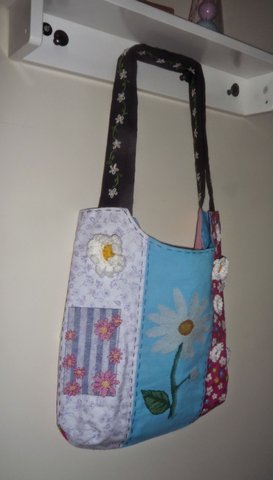 Mais uma amiga fez anos, e nós preparamos esta bela surpresa! Todos os bordados foram realizados por um grupo de amigas, e eu juntei todas as peças para construir esta carteira. Tem botão magnético e bolsos interiores. Os bordados são a ponto de cruz, bordado livre e aplicações de crochet.  Uma pequena obra de arte!