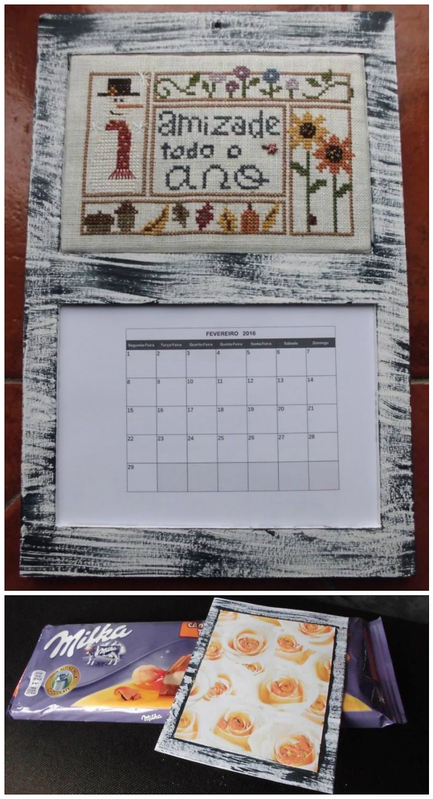 Eu entreguei o meu à Rosa, e fiz um porta calendário para a cozinha dela. Espero que lhe faça jeito, senão for para calendário para recados ou algo do genero. É uma peça que se pode adaptar facilmente a outras finalidades.